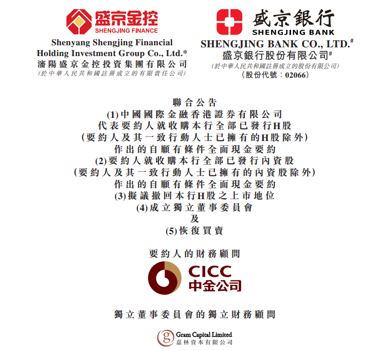 盛京银行(02066.HK)公布,沈阳盛京金控(要约人)提出自愿有条件全面要约,并拟议撤回H股之上市地位,每股H股现金价1.32港元,较停牌前收报溢价15.79%,涉及总现金代价约29.67亿港元。内资股要约价1.2元人民币。